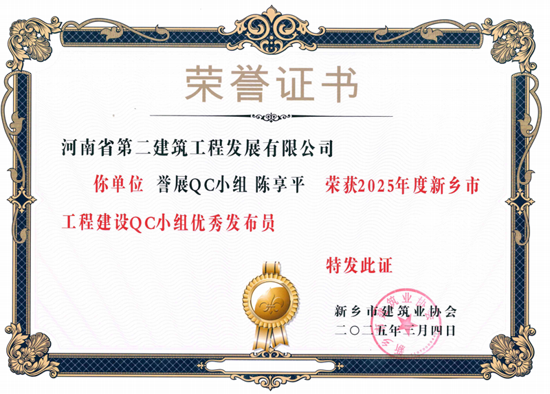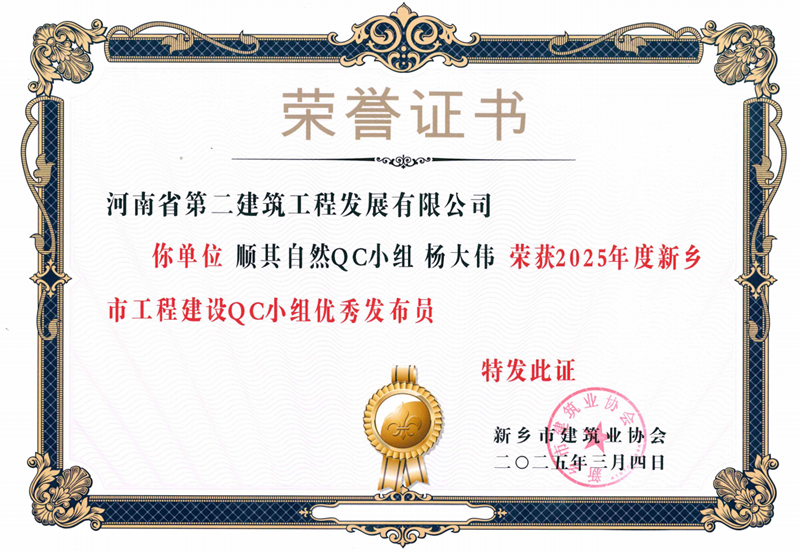 近日,由新鄉(xiāng)市建筑業(yè)協(xié)會舉辦的2025年度工程建設(shè)優(yōu)秀QC小組活動評選結(jié)果出爐,我公司申報的3項成果全部榮獲新鄉(xiāng)市一等成果,并榮獲優(yōu)秀發(fā)布員獎2項。